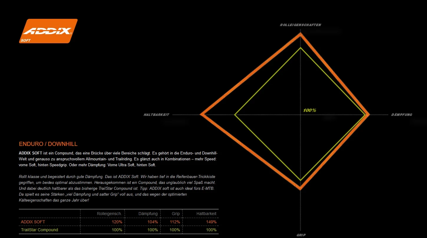 ADDIX SOFT ist ein Compound, das eine Brücke über viele Bereiche schlägt. Es gehört in die Enduro- und Downhill-Welt und genauso zu anspruchsvollem Allmountain- und Trailriding. Es glänzt auch in Kombinationen – mehr Speed: vorne Soft, hinten Speedgrip. Oder mehr Dämpfung: Vorne Ultra Soft, hinten Soft. Rollt klasse und begeistert durch gute Dämpfung. Das ist ADDIX Soft. Wir haben tief in die Reifenbauer-Trickkiste gegriffen, um beides optimal abzustimmen. Herausgekommen ist ein Compound, das unglaublich viel Spaß macht. Und dabei deutlich haltbarer als das bisherige TrailStar Compound ist. Tipp: ADDIX soft ist auch ideal fürs E-MTB. Da spielt es seine Stärken „viel Dämpfung und satter Grip“ voll aus, und das wegen der optimierten Kälteeigenschaften das ganze Jahr über!