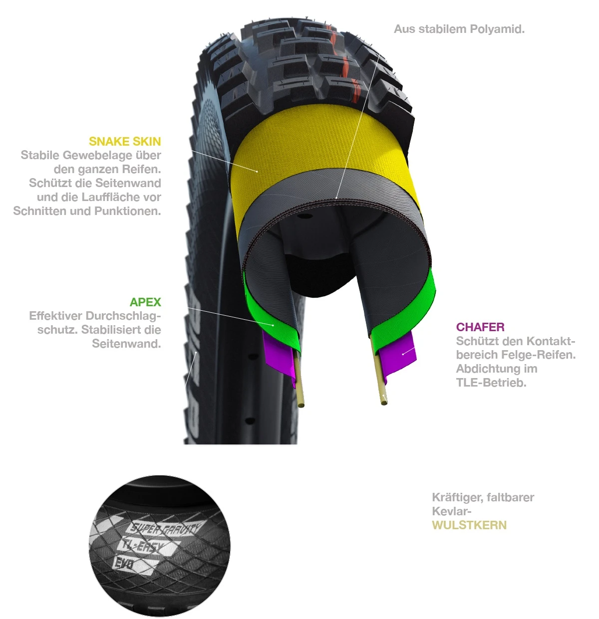 Der neue Standard für unsere MTB-Evo Reifen. Ein neues monofiles Seitengewebe bringt gleich drei Vorteile gegenüber dem bisherigen SnakeSkin-Gewebe: Noch bessere Schnittsicherheit, erhöhte Durchschlagsicherheit und vor allem ermöglicht es eine extrem leichte Tubeless Konversion. Der Einsatz von Dichtflüssigkeit ist erforderlich, aber die Montage ist ansonsten genauso leicht wie bei echten Tubeless-Reifen. Lange Konversionsprozesse mit intensivem Schütteln und häufigem Nachpumpen gibt es mit Tubeless Easy nicht mehr. Tubeless Easy ersetzt sowohl die bisherigen Tubeless Reifen als auch die Tubeless Ready Ausführung. Natürlich kann man die Reifen auch weiterhin ganz normal mit einem Schlauch montieren.